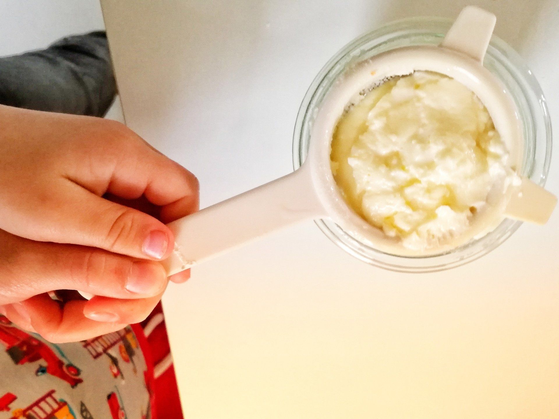 Die Anleitung habe ich aus dem Heft „Unser kleines Forscherlabor“ aus der Praxisreihe Kindergarten, aber es ist wirklich denkbar einfach. Man nehme ein Einmachglas und Sahne, schütte die Sahne in das Glas, drehe den Deckel darauf und schüttle! Einfach so lange bis die Sahne klumpig wird. Dann einfach durch ein Sieb oder ein Tuch schütten, was bleibt ist Butter und die Flüssigkeit ist Buttermilch. Wir haben unsere Butter gleich danach mit frischen Brezen degustiert. Wer nicht schütteln möchte oder kann – ich würde ohnehin empfehlen sich abzuwechseln – kann einen Handrührer nehmen, aber das ist etwas wie schummeln😊.