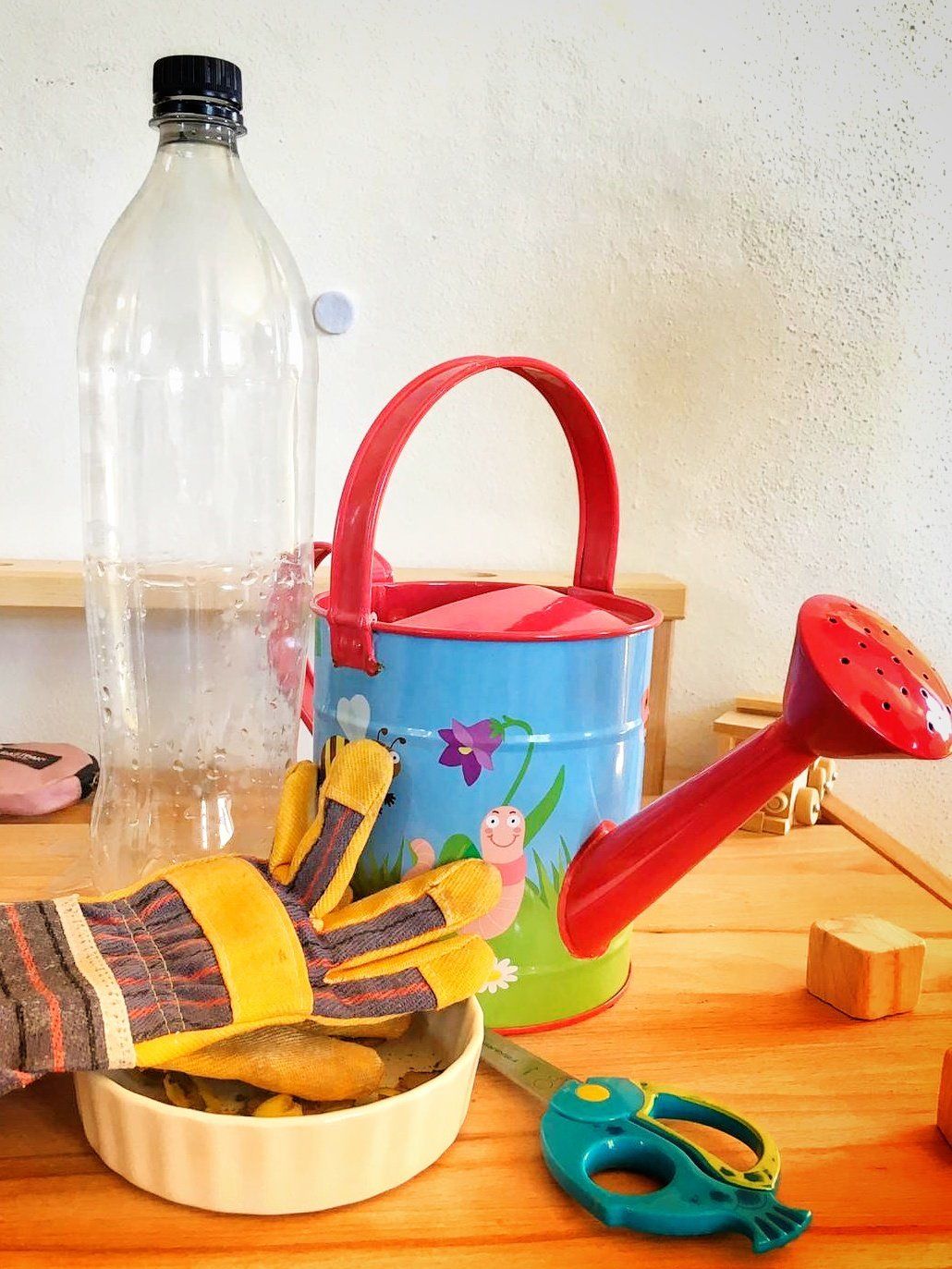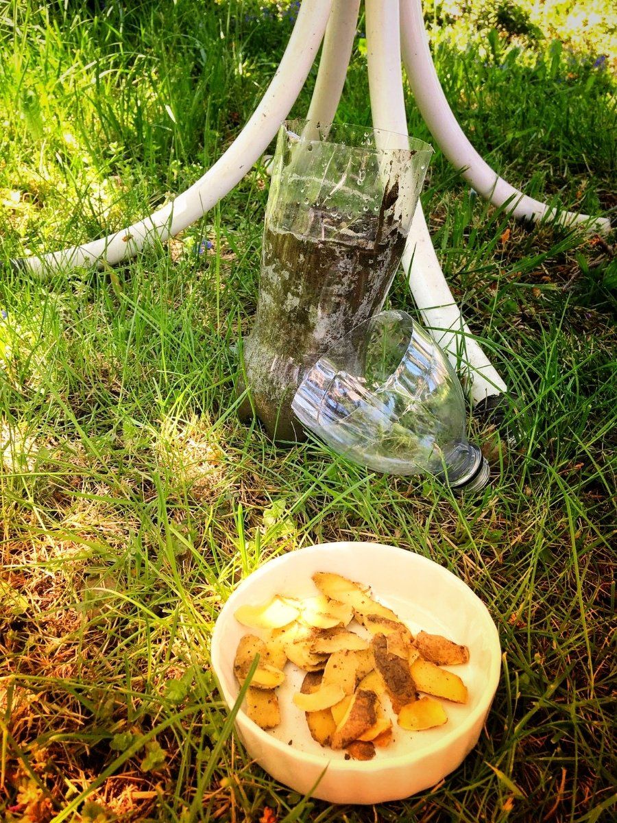 Die Anleitung haben wir aus dem Buch „Das Große Gartenbuch für Kinder“ von Jenny Hendy, dass ich sehr empfehlen kann, wenn man seinen Kindern das Gärtner näherbringen möchte. Ältere Kinder finden dort auch Anleitungen für eigene Projekte und alles ist sehr verständlich erklärt. Für die Wurmfarm braucht man eine leere PET-Flasche, Erde, gewaschenen Sand, Kartoffelschalen, eine Gießkanne, einen schwarzen Plastiksack oder Folie und eine Schere.