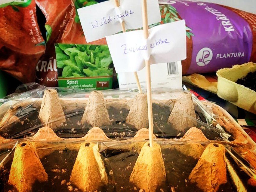 Alles was man braucht sind Eierkartons (leer versteht sich, wir wollen ja nicht, dass es zu Unklarheiten kommt), Anzuchterde, Samen, Frischhaltefolie und für die, die mit Pflanzen noch gar nichts zu tun hatten: Wasser! Anzuchterde haben wir online bestellt, aber da jetzt einige Läden wir öffnen dürfen, kann man sie jetzt sicher auch wieder irgendwo kaufen. Samen haben wir beim Supermarkt erstanden.