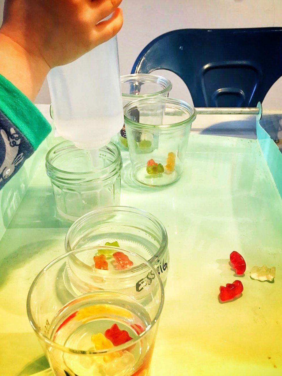 Fazit ist: mein Sohn war Feuer und Flamme sobald er das Wort Gummibärchen gehört hat, natürlich auch deshalb, weil man testen muss, ob die Gummibärchen noch gut sind, bevor man mit dem Experiment beginnt. Dann kann man den Kindern wirklich vermitteln, wie ein Experiment abläuft, zum Beispiel, dass man alles beschriften muss. Wer schon einmal vergessen hat im Labor sein Eppendorf Tube zu beschriften, weiß wovon ich rede. Dann formuliert man seine Hypothesen und schaut dann, ob sie sich bewahrheiten oder widerlegt werden. Wenn die Kinder schon schreiben können, kann es auch dokumentiert werden und zum Beispiel auch feste Zeitabstände eingehalten werden. Wir haben die Gummibärchen etwas länger als einen Tag stehen lassen und mein Sohn hat sie immer wieder angeschaut und angefasst und war begeistert. Heute hat er mich gefragt, wann wir das nächste Experiment machen, ich denke, dass kann man als Erfolg verbuchen😊.