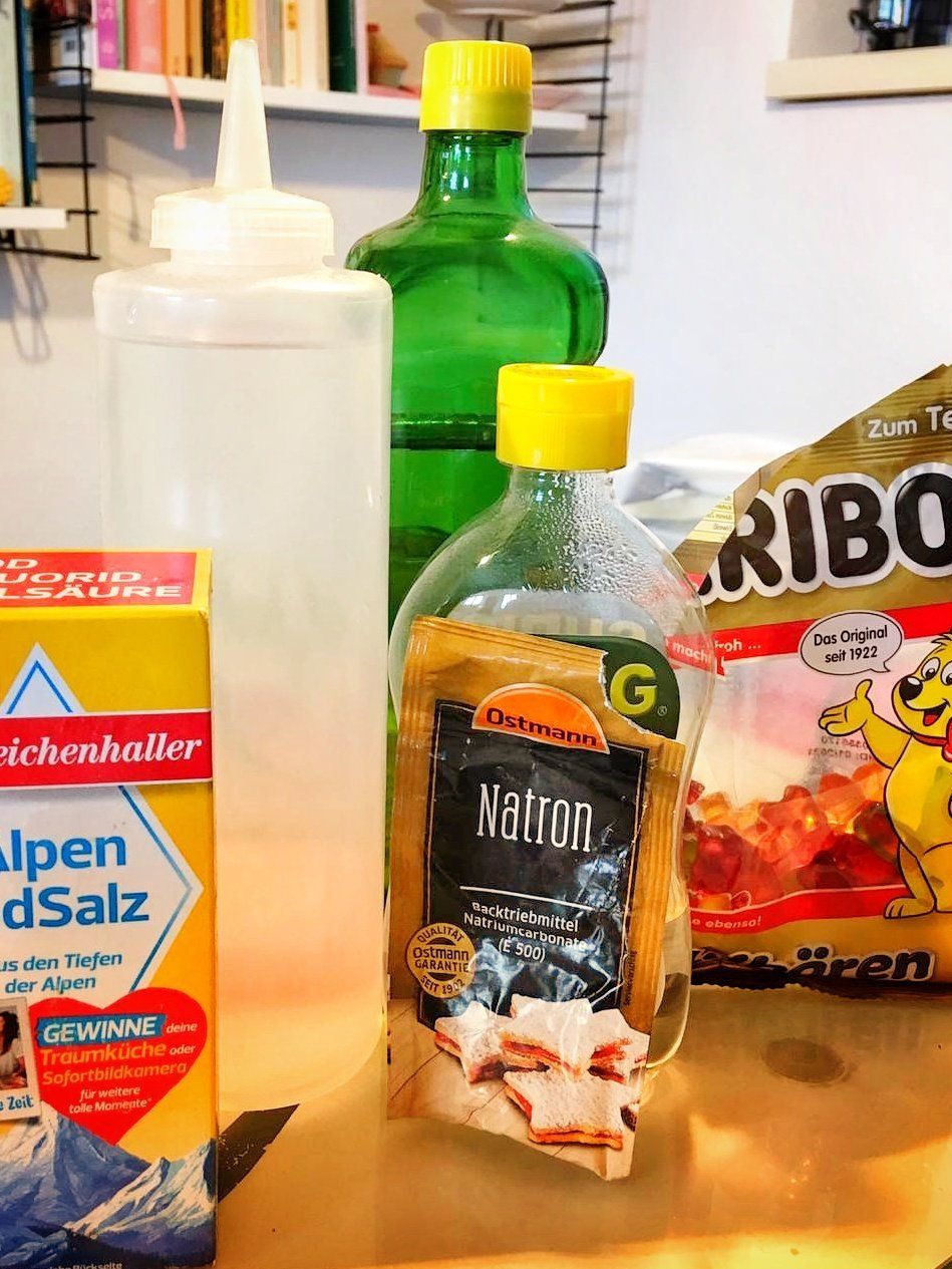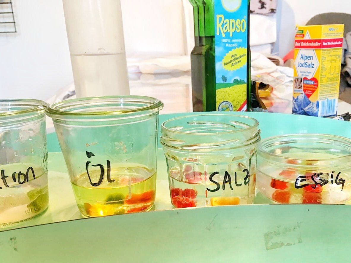 Worum geht es dabei? Man legt Gummibärchen in verschiedene Medien ein, also Salzwasser, Essig, Öl, Natron und Wasser und beobachtet dann die nächsten Stunden oder auch Tage, was mit ihnen passiert. Das hört sich jetzt erstmal nicht besonders spannend an, ist aber nicht zu unterschätzen, denn wenn man es wie ein tatsächliches Experiment mit dem Kind oder den Kindern aufbaut, lernen sie im kleinen Rahmen, wie Forschung funktioniert. Zunächst ist zwar das Experiment erst einmal vorgegeben, wir haben uns an folgende Anleitung gehalten https://waswirspielen.com/2019/09/14/forschen-und-staunen-mit-gummibarchen/, aber dann sind die Kinder an der Reihe. Sie können sich überlegen, was mit den Gummibärchen in den verschiedenen Flüssigkeiten passieren könnte, hier kann man auch etwas nachhelfen und dann geht es ans Beobachten. Was passiert mit den Gummibärchen? Wie sehen sie aus? Wie fühlen sie sich an? Die Auflösung gibt es nur dann, wenn ihr es selbst ausprobiert, deshalb auch nur Fotos vom Beginn des Experiments, so will ich euren Forscher*innengeist wecken😊.